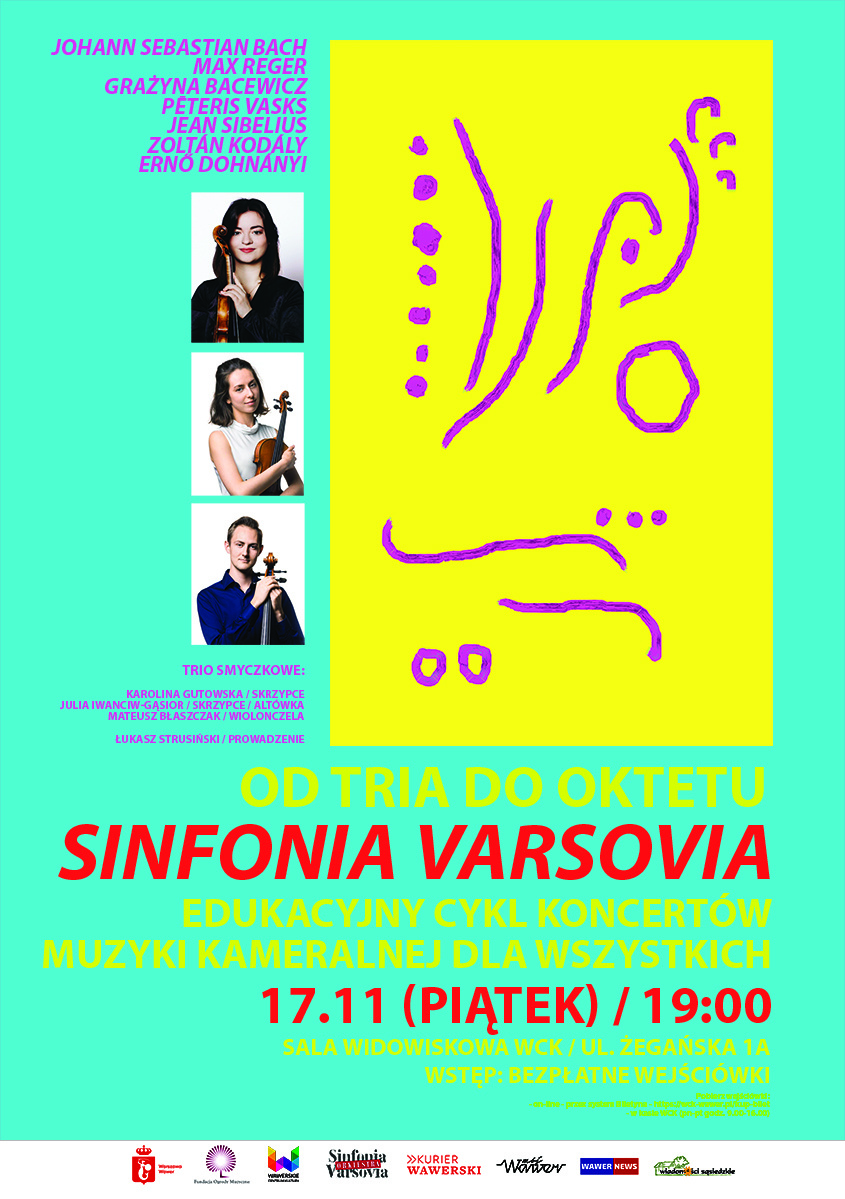 W ramach cyklu „Od tria do oktetu” organizowanego tej jesieni przez Fundację Ogrody Muzyczne w Wawerskim Centrum Kultury słuchacze zapoznają się z dwoma stałym zespołami kameralnymi orkiestry: kwartetem smyczkowym Sinfonia Varsovia Camerata (21 października 2023), składającym się z młodych i utytułowanych muzyków orkiestry oraz liderami grupy instrumentów dętych drewnianych, tworzących Sinfonia Varsovia Wind Quintet (1 grudnia). W koncercie 17 listopada wystąpi trio smyczkowe młodych instrumentalistów, utworzone niedawno z okazji międzynarodowego projektu, który Sinfonia Varsovia prowadziła w Norwegii i w Polsce.