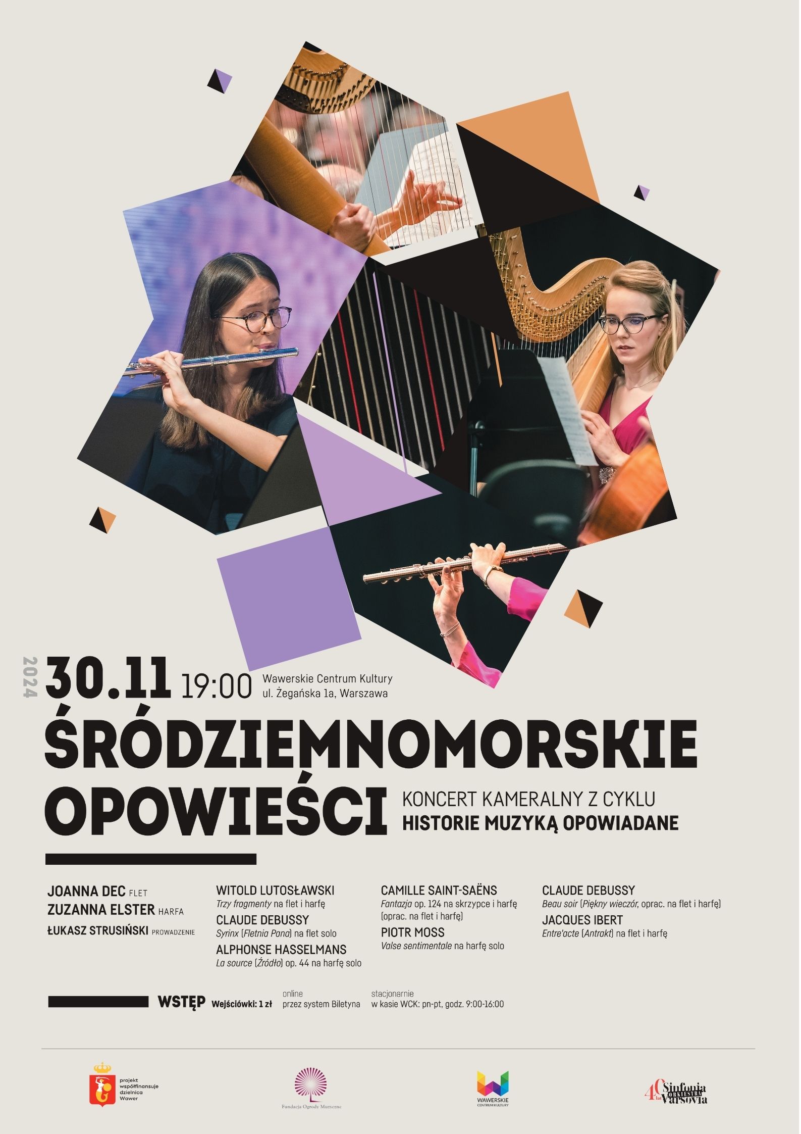W ostatnim koncercie cyklu Historie muzyką opowiadane sięgniemy po flet i harfę – instrumenty, które nader często występują razem w muzyce klasycznej. Łączy je również starożytne pochodzenie, sięgające kilku tysięcy lat wstecz. Ich brzmienie przywołuje śródziemnomorskie mity, daje posmakować egzotyki południa Europy z jego światłem i połyskującymi na morskich falach promieniami słońca. Kto tego słońca potrzebuje w listopadowy wieczór, powinien się czuć zachęcony do wysłuchania tego koncertu!
