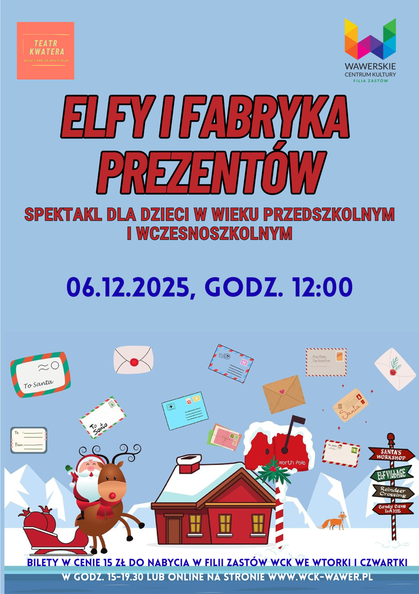 Spektakl i fabryka prezentów Świętego Mikolaja" pełen magii i przygód spektakl Teatru Kwatera, przeznaczony dla dzieci w wieku przedszkolnym oraz uczniów klas I-III szkoły podstawowej. Już od pierwszych chwil widzowie przenoszą się do fabryki zabawek Świętego Mikołaja, gdzie elfy z zapałem przygotowują wszystko na zbliżające się święta.