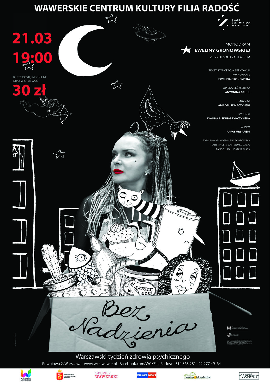 Ewelina Gronowska - tekst, koncepcja spektaklu i wykonanie, Antonina Brühl - opieka reżyserska, Amadeusz Naczyński - muzyka, Rafał Urbański - wideo, Joanna Biskup-Brykczyńska - rysunki, Joanna Plata - tango Krok